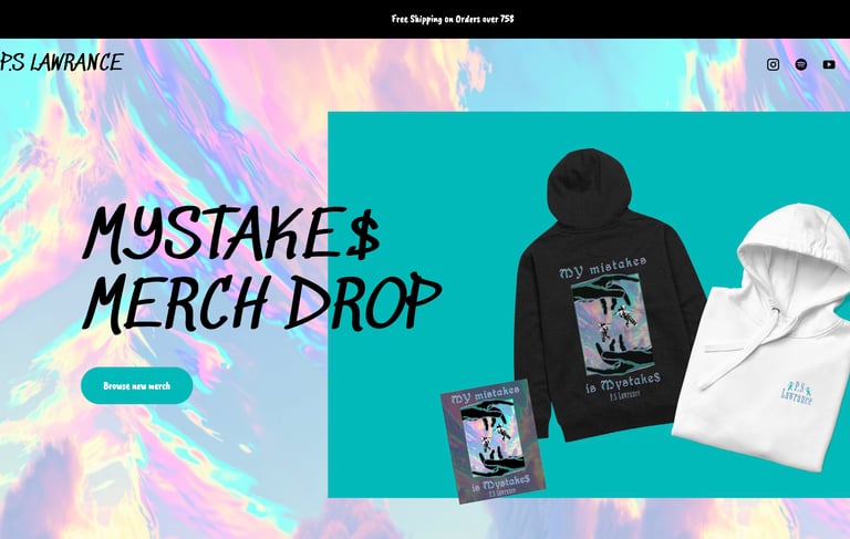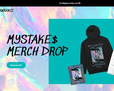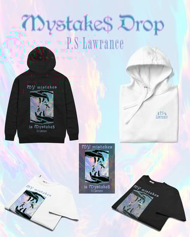 P.S. Lawrance wanted his merch to reflect his cosmic sound โ retro-futuristic, reflective, and a bit chaotic. We created a space-inspired visual identity with glitch textures, holographic tones, and his signature message: turning mistakes into art.