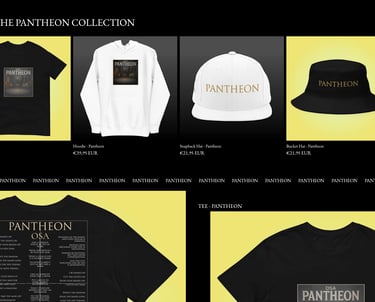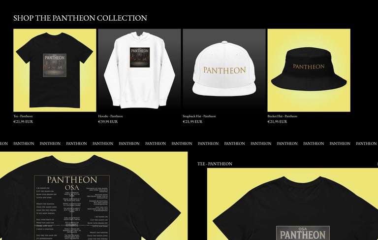 When Osa dropped his single Pantheon, we built the entire merch line around the songโs cover art โ using its visuals and mood as the foundation. The result: a cohesive, minimal design that mirrors the singleโs dark elegance and helps fans wear the story behind the music.